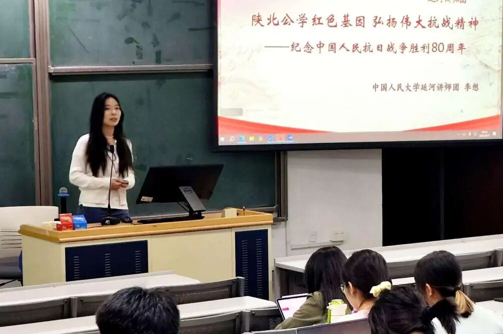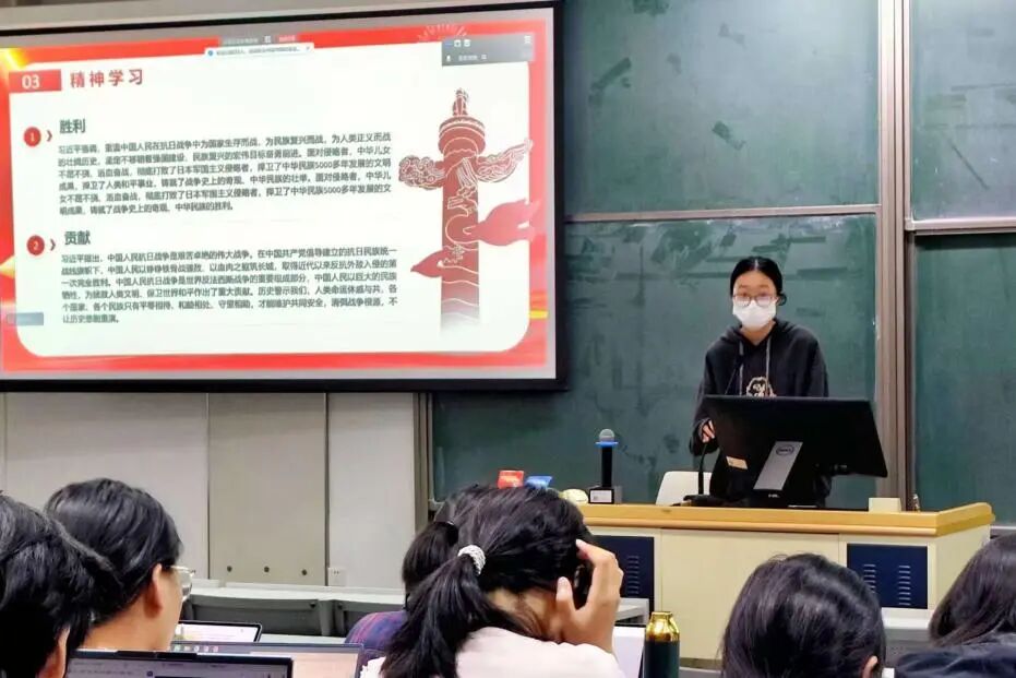 各团支部积极邀请延河讲师团成员开展宣讲。公共管理学院博士生沈明辉以“从人民群众浴血抗战的事迹中体悟人民战争的磅礴力量”为主题,为多个团支部进行分享。从回顾抗战历程,到解读抗战精神内涵,再到鼓励青年在新时代践行担当,她用丰富的史料和新时代发生的实际案例,让团员们对伟大抗战精神中的人民力量有了更深刻的体悟。讲师团李想围绕陕北公学在抗战中的贡献,结合英雄范例,为同学们讲述陕公师生的担当与奉献,激励大家传承抗战精神,为中国式现代化挺膺担当。刘竞聪以“在每一个现场”为题,呼吁全体同学要深刻领悟总书记讲话中关于“开创未来”的部署要求,继承先辈遗志,传承红色基因,找准自己的人生坐标和奋斗“现场”。