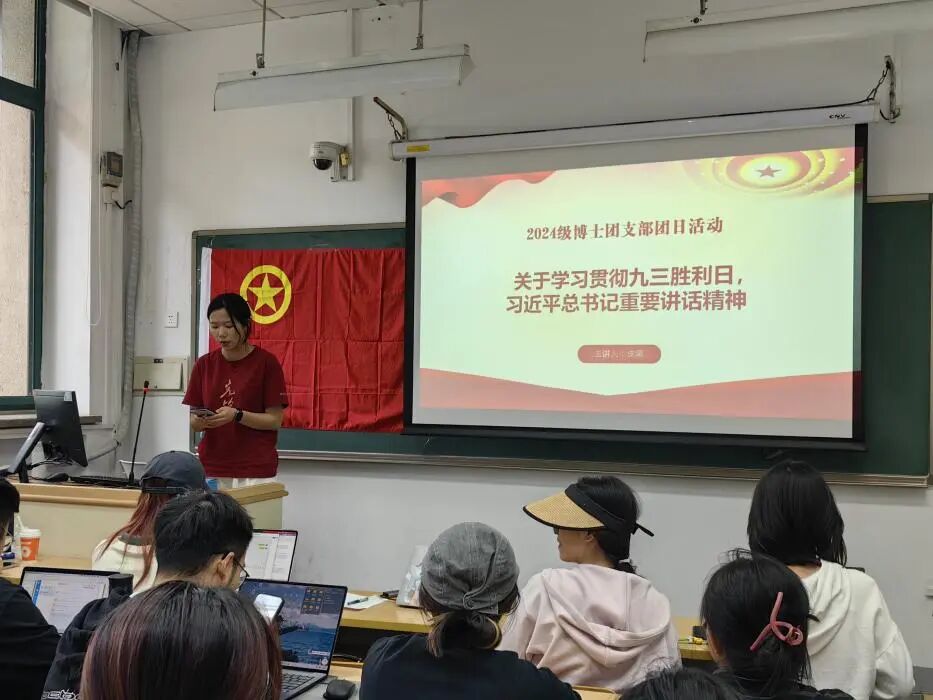 各团支部纷纷组织专题学习会,带领团员青年原原本本研读习近平总书记重要讲话精神。2023级人文古典2班团支部在团支书陈雨彤的带领下,共同观看讲话现场视频,重温重要金句,并从“胜利”“贡献”“和平”“建设”“奋斗”五个关键词展开深入学习。同学们深刻认识到抗战胜利的伟大意义,坚定了为民族复兴而奋斗的信念。2024级硕士一班与24级博士班团支部联合举办主题团日活动,24级博士班团支部书记皮曦在领学中强调学习重要讲话精神,对站在学术前沿的研究生明确自身肩负的历史责任与时代使命,具有不可替代的指导作用,并号召大家将总书记的殷殷嘱托转化为前进动力。