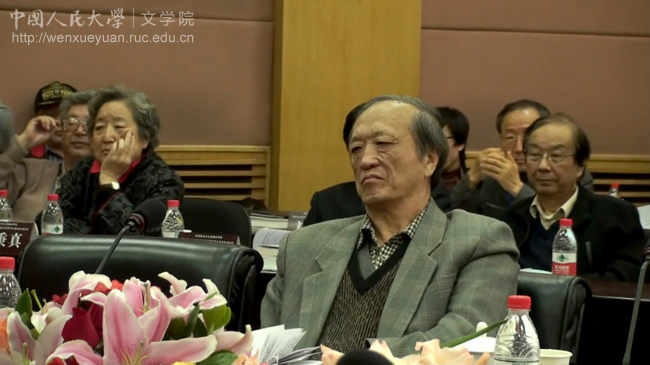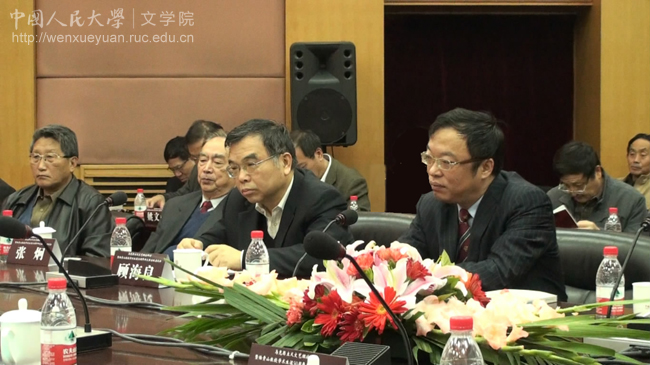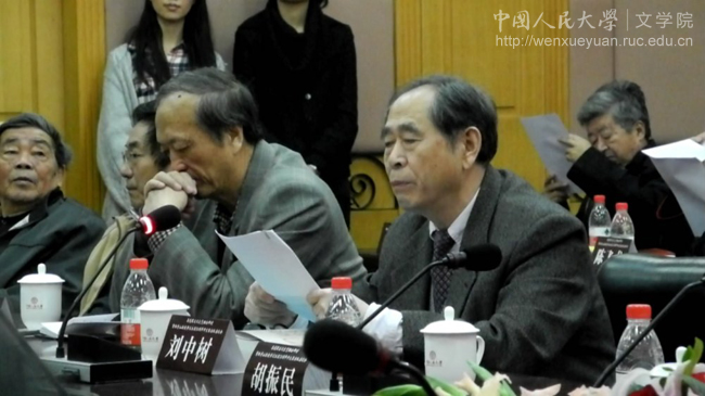吉林大学原校长刘中树在发言,其右2陆贵山教授,右3中国社会科学院外国文学研究所党委书记兼副所长党圣元,右4为中国人民大学教授陈传才