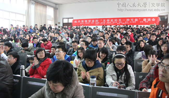 2013年3月31日14:00,我院第七届文学节系列活动之“文学史的另一种可能”座谈会在公共教学三楼3101教室举行。出席座谈会的嘉宾有:著名画家、文艺评论家、作家陈丹青先生,中国美术学院曹立伟教授,青年评论家李静女士,著名学者陇菲先生,上海财经大学人文学院马宇辉副教授,浙江大学中文系许志强教授,著名学者岳建一先生,北京师范大学文学院张柠教授,《南方周末》著名记者朱也旷先生,以及我院程光炜教授和杨联芬教授。座谈会由我院院长孙郁教授主持。很多文学爱好者慕名而来,现场座无虚席,气氛十分热烈。