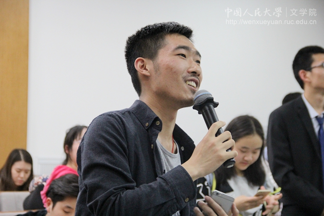 随后刘震云教授与埃斯普马克先生就本次讲座的主题进行深入交谈,在刘震云教授看来,知识就是那些不同的见解和未解决的问题,他幽默的发言引发现场同学热烈反响。在讲座最后的交流环节,埃斯普马克先生与听众们就诺贝尔文学奖及文学跨国界的相关问题进行交流。