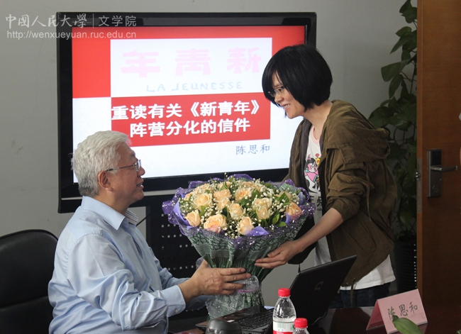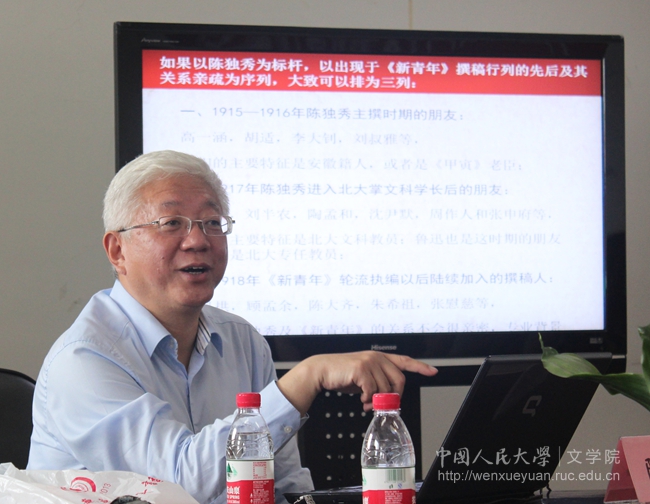 5月17日上午九点三十分,“何其芳系列讲座”的第一讲陈思和教授“重读有关《新青年》阵营分化的信件”讲座在人文楼七层会议室举行。文学院程光炜教授担任讲座主持,李今教授出席本场讲座。