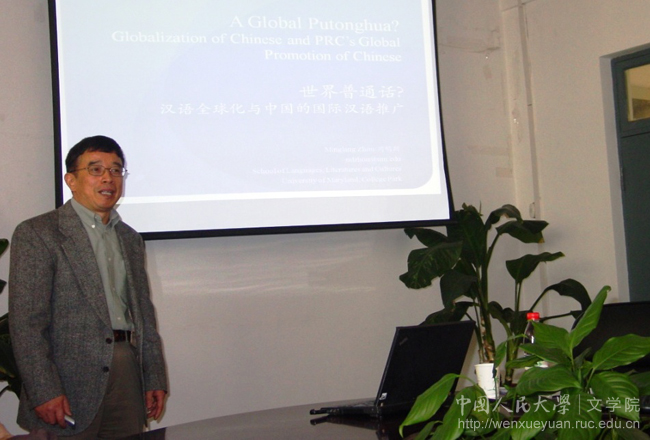针对当前民众非常关注且国内语言学界倍感困扰的热点问题,3月16日下午,美国马里兰大学副教授、中文部主任、东亚研究中心主任周明朗的报告“世界普通话?汉语全球化与中国的国际汉语推广”帮我们打开了更多的思路。讲座由文学院对外汉语教学中心张璐博士主持,二十余位老师和几十名研究生听取报告并参与讨论,大家济济一堂,气氛非常热烈。