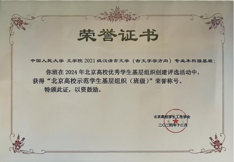 多年来的深耕细作,让文学院班主任和班团建设工作结出了累累硕果。近三年,文学院徐楠、江棘、李昕揆等班主任老师凭借突出的育人成效,获评“中国人民大学优秀班主任”等荣誉;多个班级凭借浓厚的学风、强大的凝聚力,荣获学校“先进班集体”“示范班集体”称号;走出校园,被表彰为“北京高校示范学生基层组织(班级)”“北京市先进班集体”。2024、2025年连续两年斩获学校本科、研究生十佳班集体(红旗团支部)“双十佳”的优异成绩。这些荣誉的背后,是每一位班主任的“辛苦活”“良心活”“技术活”,是学院对班主任工作的持续重视,更是“文学院温度”在育人实践中的生动体现。
