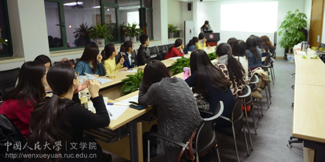 晚上6:30,活动正式开始。李博洋同学首先按不同的就业领域为大家介绍了文学院近十年毕业生的去向。她提到,我院硕士毕业生的就业领域基本分为媒体及出版单位、政府机构、国家企事业单位、私营企业、外资企业、高等院校及科研院所、中学、国内读博、出国深造等十个方面。在2014届的85位学术型硕士研究生中,选择媒体及出版单位、政府机构、国家企事业单位作为就业方向的占绝大多数,而选择读博和出国深造的毕业生人数则相对较少。李博洋同学还通过详细的数据和图表让大家看到了十年来各领域就业情况的发展变化,并结合历年政策的不同简要说明了变化原因,让大家对我院毕业生的就业选择有了直观的了解。随后,袁雪飞同学则分别向大家详细介绍了2014届硕士研究生文艺学、比较文学与世界文学、现当代文学、古代文学、语言学及应用语言学、汉语言文字学、古典文献学、电影学等九个专业毕业生的就业情况。各专业由于研究方向的不同呈现出各自的择业特点,例如古代文学的毕业生很多选择高校或者读博继续学术研究的道路,电影学专业的毕业生则多选择在剧院或传媒公司就业。通过主持人条分缕析的讲解,大家对我院近十年尤其是2014届硕士毕业生的就业情况有了清楚的认识。