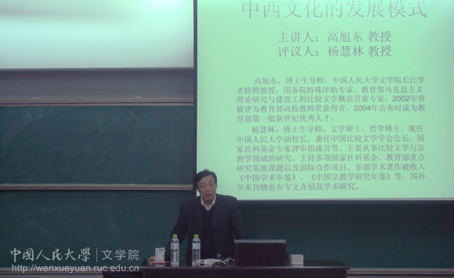 下午,中国人民大学副校长杨慧林教授、中国人民大学文学院教授高旭东一起做客人大国际学院语言文化论坛。高旭东教授作为主讲人,杨慧林教授作为评议人,共同为汉语国际教育的同学们带来以《中西方文化的发展模式》为主题的讲座。人大国际学院副院长陈满华教授和相关教师聆听了本次讲座。