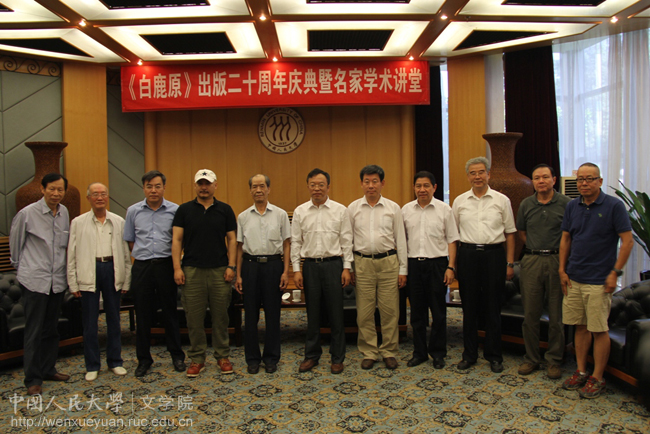 9月12日下午,由中国人民大学文学院与人民文学出版社联合举办的“《白鹿原》出版二十周年庆典暨名家学术论坛”在逸夫会议中心第一报告厅隆重举行。出席本次活动的来宾有:长篇小说《白鹿原》作者陈忠实,电影《白鹿原》编剧、导演王全安,舞剧《白鹿原》导演夏广兴,中国出版集团副总裁潘凯雄,人民文学出版社社长兼总编辑、我院知名校友管士光,人民文学出版社前副总编辑、《白鹿原》首版编辑何启治等。马俊杰副书记、杨慧林副校长在逸夫会议中心贵宾厅隆重会见了陈忠实一行,并向陈忠实等人赠送了我校75周年校庆纪念品。