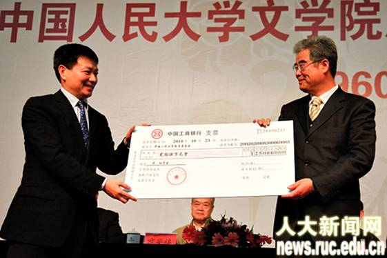 在2010年10月23日召开的中国人民大学文学院成立50周年院庆大会上,文学院79级校友、北京华辰拍卖有限公司董事长甘学军向学院捐赠了25万元,用以设立华辰文化教育基金,支持文学院的文化教育发展事业,资助文学院的优秀学生。在捐赠发言中,甘学军提及“母校给我们最大的滋养就是教我们怎么去审美,怎么去实践美,这在我们的日常生活中不经意地起着非常根本的作用。” 他表达了对文学院各位教学工作者的钦佩和敬仰,肯定了在文学院的学习对他的滋养,也希望其他校友能够为文学院发展贡献力量。