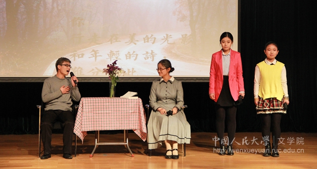 独诵过后,由我院13级本科生李薇担任社长的文渊汉服社为观众们带来舞蹈《芙蓉池》。接着,群诵组的同学们展现出与独诵组不同的风采。其中新闻学院带来《承继 出发》,展现同学们作为记者的担当,体现新闻学子的职业信仰。而文学院的群诵《文学不死,青春不息》则在朗诵中加入情景表演,通过三代人的青春展现文院学子的文学追求。统计学院的《梦在北京》则表现了同学们对于北京这座生活、学习的城市的特殊情感和追求梦想的信念。