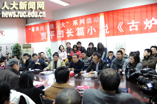 1月9日,由中国人民大学文学院、中国人民大学当代文艺思潮研究所主办的“著名作家进人大”系列活动之二“贾平凹长篇小说《古炉》研讨会”在中国人民大学文学院召开。中国人民大学党委副书记马俊杰教授、文学院院长孙郁教授、文学院程光炜教授、姚丹副教授、杨庆祥博士以及来自中国人民大学、北京大学等高校的博士研究生、硕士研究生近100多人参加了此次研讨会。会议由作家阎连科主持。