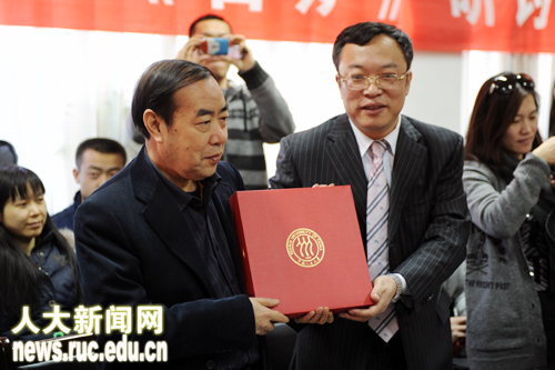 马俊杰教授代表学校热烈欢迎贾平凹先生的研讨会如期在人大召开,并向贾平凹先生赠送了人大校徽。